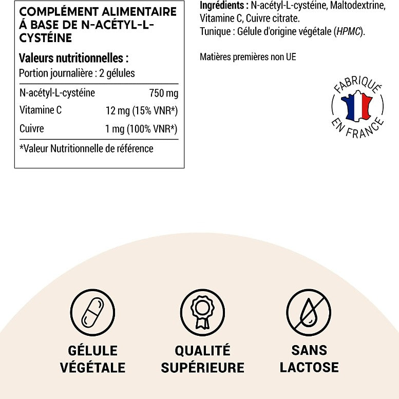 N-Acétyl-L-Cystéine, Maltodextrine, Vitamine C, Cuivre citrate.Tunique : Gélule d'origine végétale